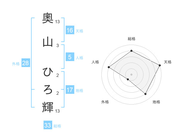 奧山 ひろ輝さんを姓名の画数から五運を鑑定