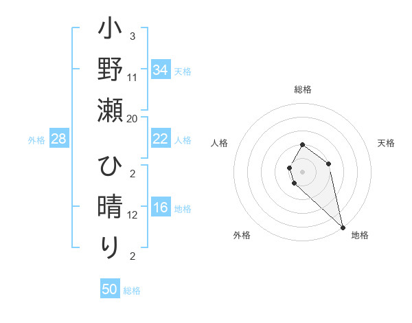 小野瀬 ひ晴りさんの総格は50画の2点!