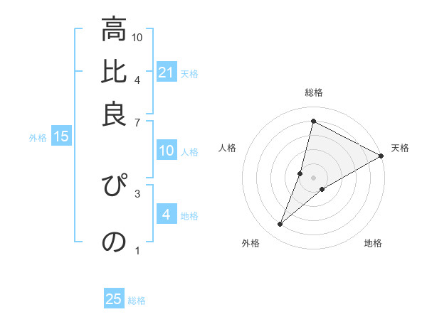 高比良 ぴのさんの天格は21画の5点!