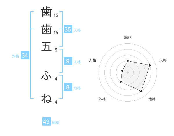 歯歯五 ふねさんの総格は43画の2点!