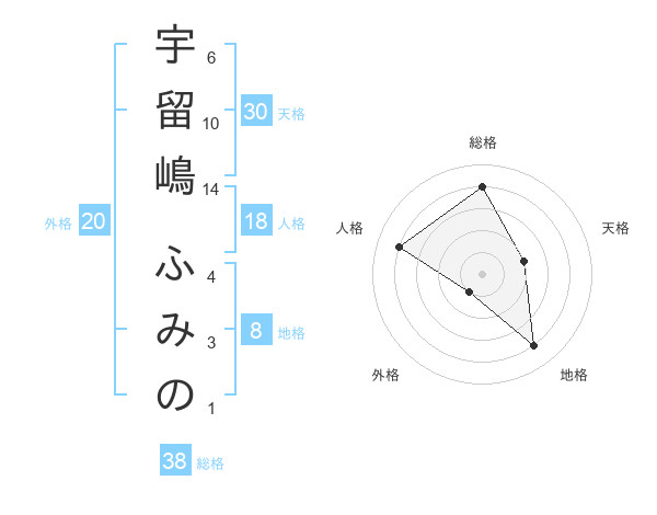 宇留嶋 ふみのさんの総格は38画の4点!