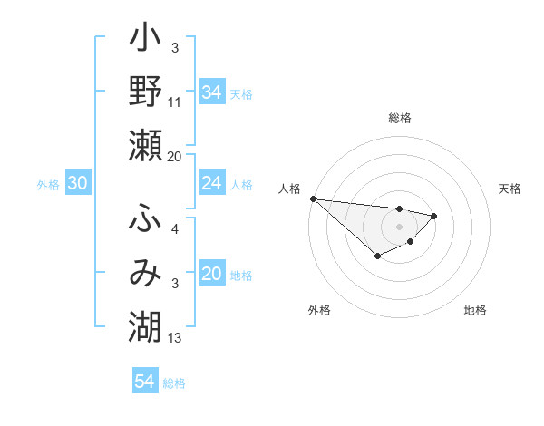 小野瀬 ふみ湖さんの総格は54画の1点!