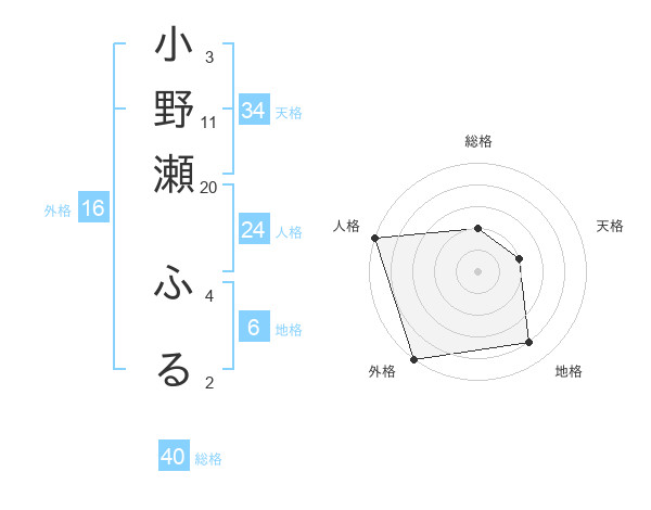 小野瀬 ふるさんを姓名の画数から五運を鑑定