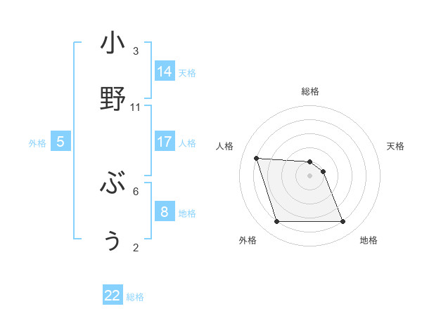 小野 ぶぅさんを姓名の画数から五運を鑑定