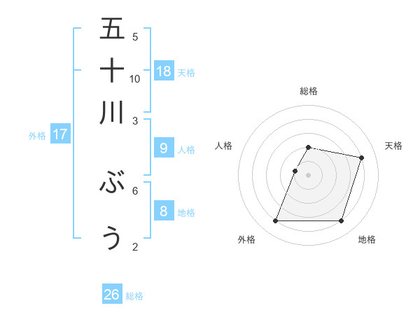 五十川 ぶうさんを姓名の画数から五運を鑑定