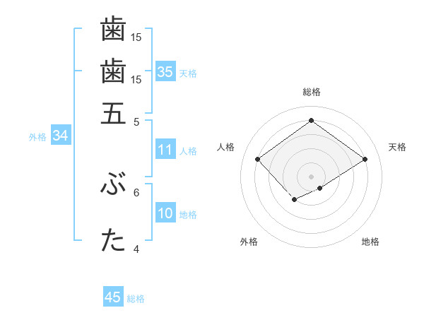 歯歯五 ぶたさんの総格は45画の4点!