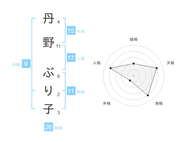 丹野 ぶり子さんを姓名の画数から五運を鑑定