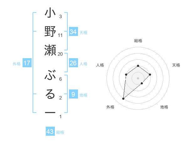 小野瀬 ぶるーさんを姓名の画数から五運を鑑定