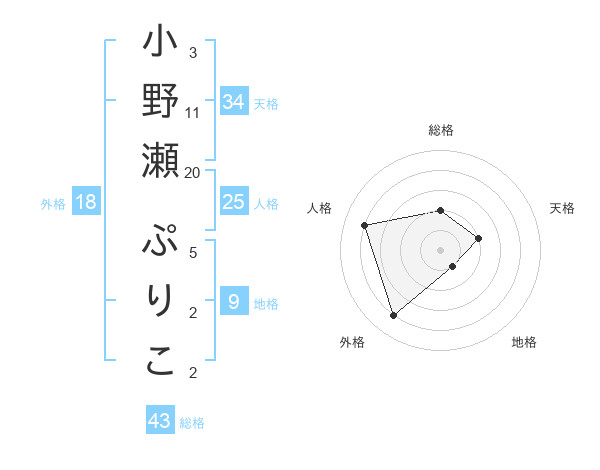 小野瀬 ぷりこさんの総格は43画の2点!