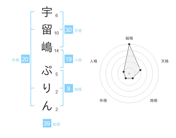 宇留嶋 ぷりんさんの総格は39画の5点!