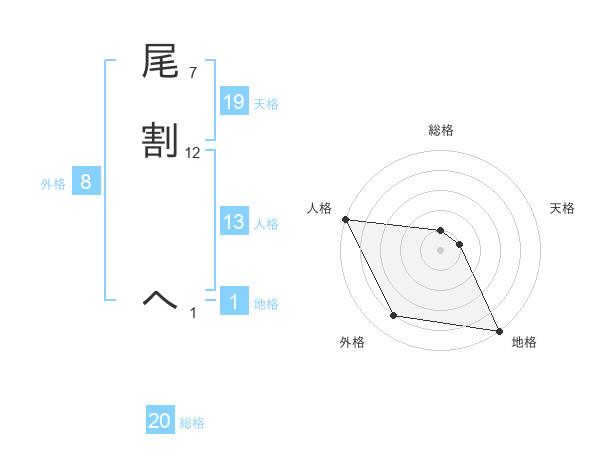 尾割 へさんの総格は20画の1点!