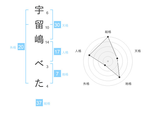 宇留嶋 べたさんの総格は37画の5点!