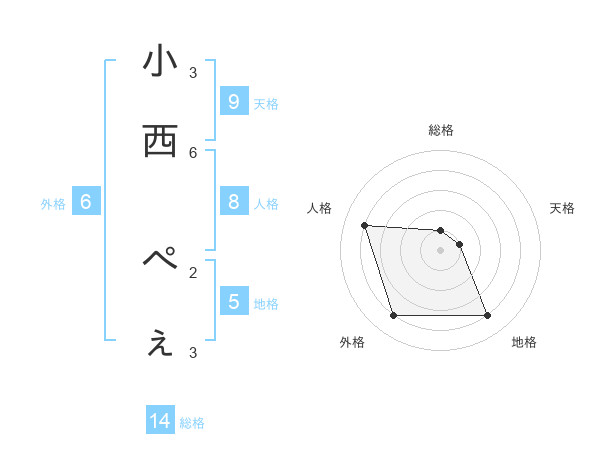 小西 ぺぇさんの総格は14画の1点!