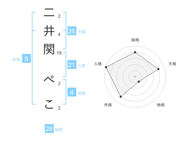 二井関 ぺこさんの総格は29画の4点!