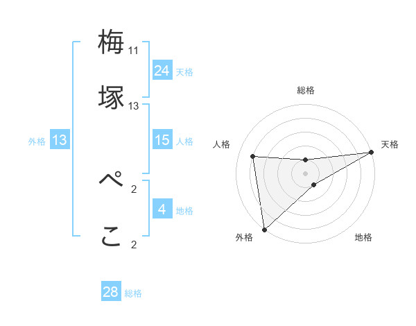 梅塚 ぺこさんを姓名の画数から五運を鑑定