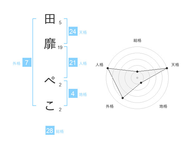 田靡 ぺこさんの外格は7画の4点!