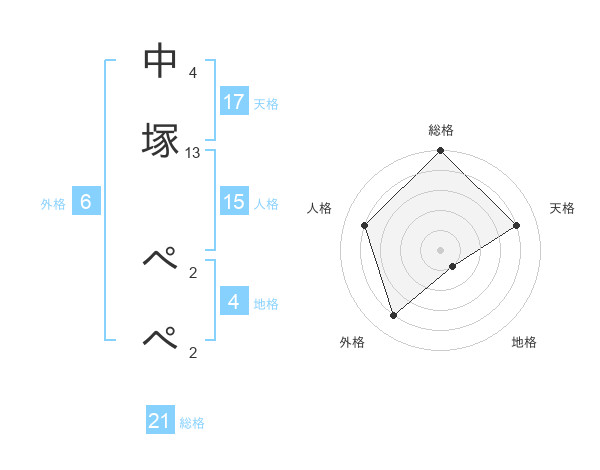 中塚 ぺぺさんの総格は21画の5点!
