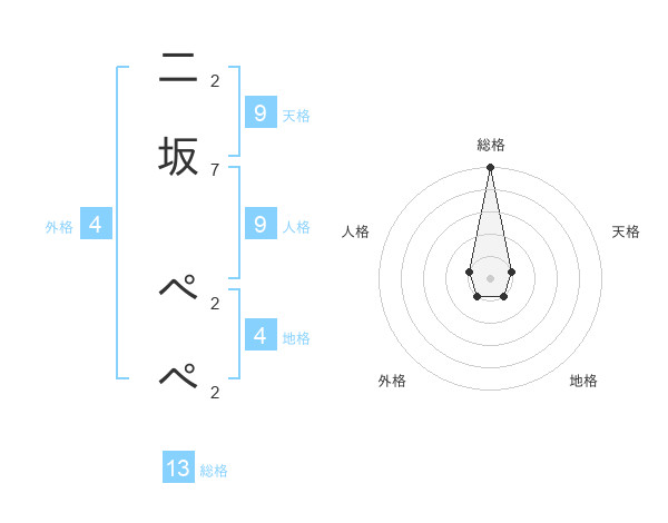 二坂 ぺぺさんの総格は13画の5点!