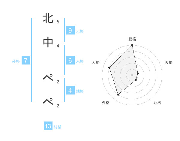 北中 ぺぺさんの総格は13画の5点!