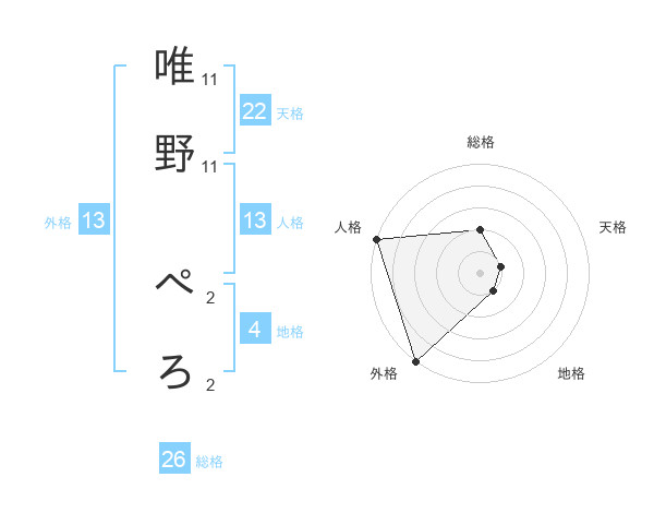 唯野 ぺろさんを姓名の画数から五運を鑑定