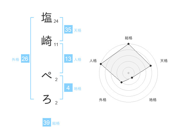 塩崎 ぺろさんを姓名の画数から五運を鑑定