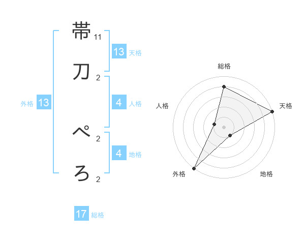 帯刀 ぺろさんの外格は13画の5点!