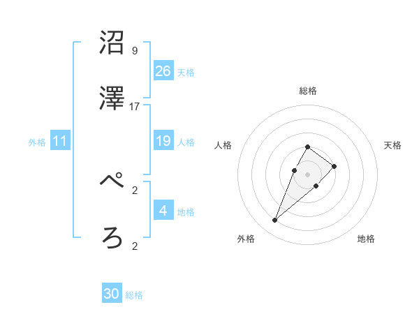 沼澤 ぺろさんを姓名の画数から五運を鑑定