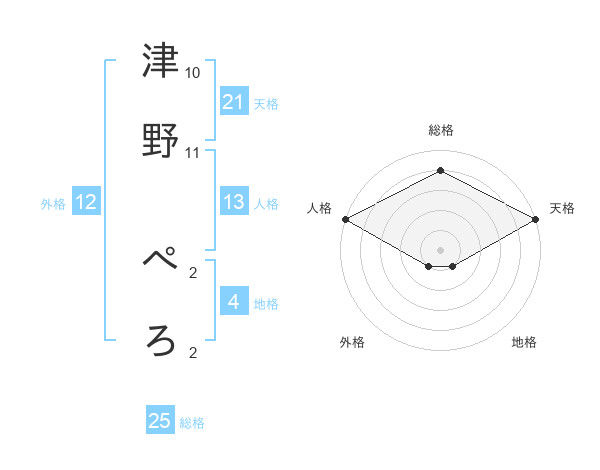 津野 ぺろさんを姓名の画数から五運を鑑定
