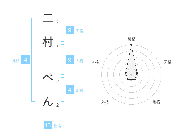 二村 ぺんさんの総格は13画の5点!