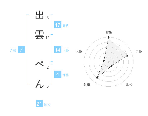出雲 ぺんさんを姓名の画数から五運を鑑定