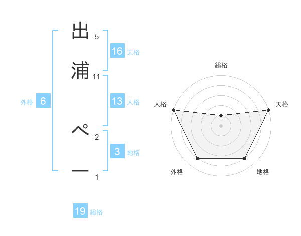 出浦 ぺーさんを姓名の画数から五運を鑑定