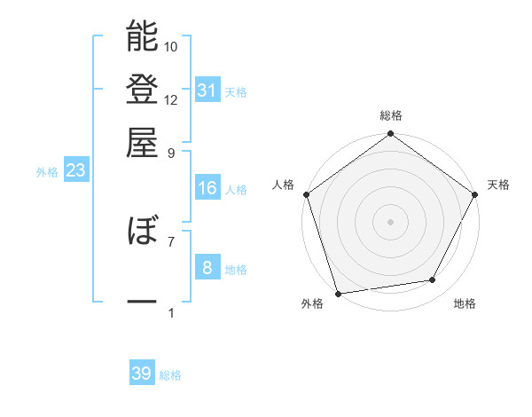 能登屋 ぼーさんの総格は39画の5点!