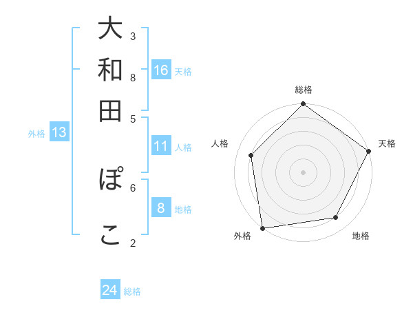 大和田 ぽこさんの外格は13画の5点!