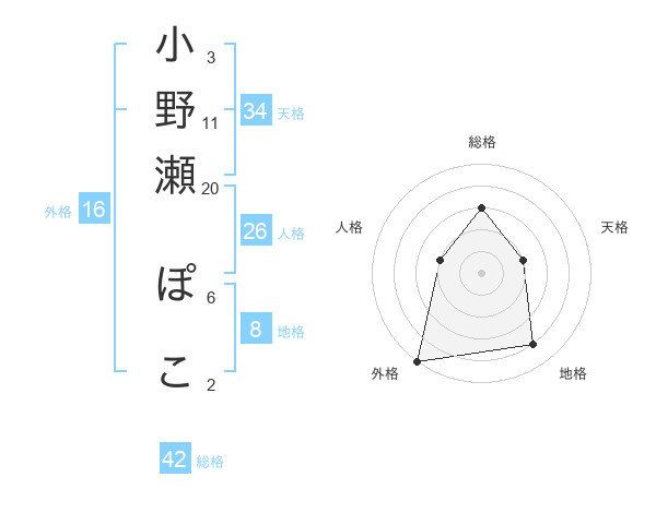 小野瀬 ぽこさんの地格は8画の4点!