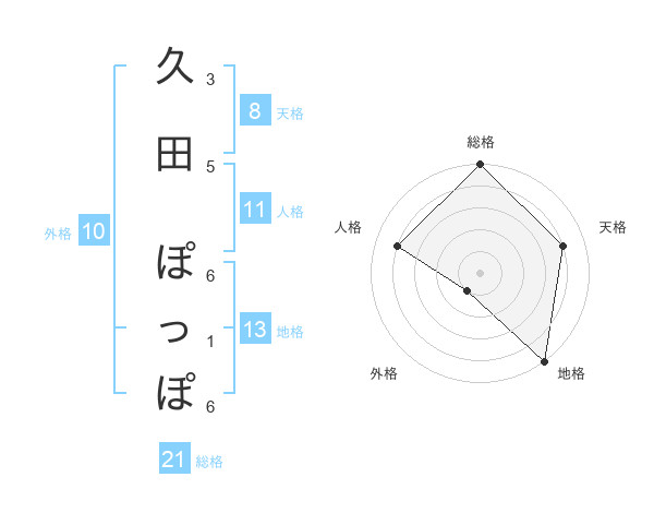 久田 ぽっぽさんの総格は21画の5点!