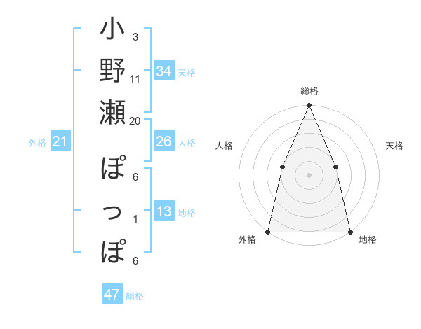 小野瀬 ぽっぽさんの総格は47画の5点!