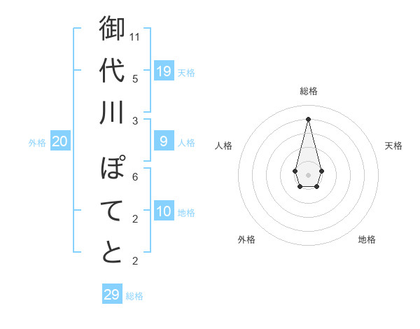 御代川 ぽてとさんの総格は29画の4点