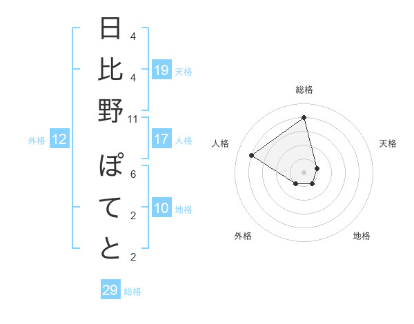 日比野 ぽてとさんを姓名の画数から五運を鑑定
