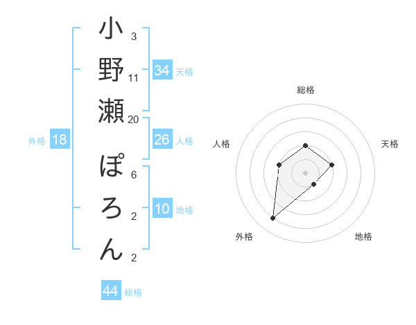 小野瀬 ぽろんさんを姓名の画数から五運を鑑定