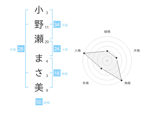 小野瀬 まさ美さんの総格は50画の2点!