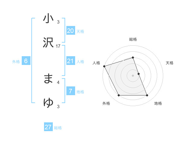 小沢 まゆさんを姓名の画数から五運を鑑定