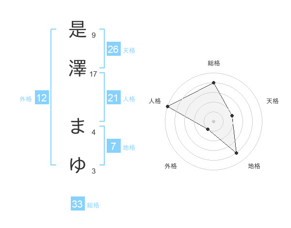 是澤 まゆさんの総格は33画の4点!