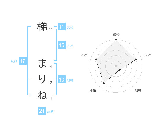 梯 まりねさんの総格は21画の5点!