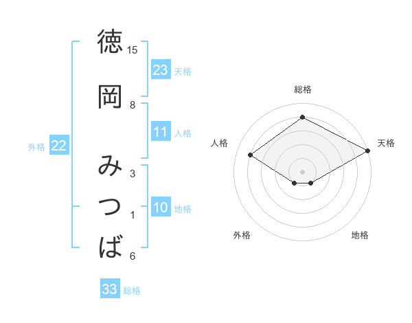 徳岡 みつばさんを姓名の画数から五運を鑑定