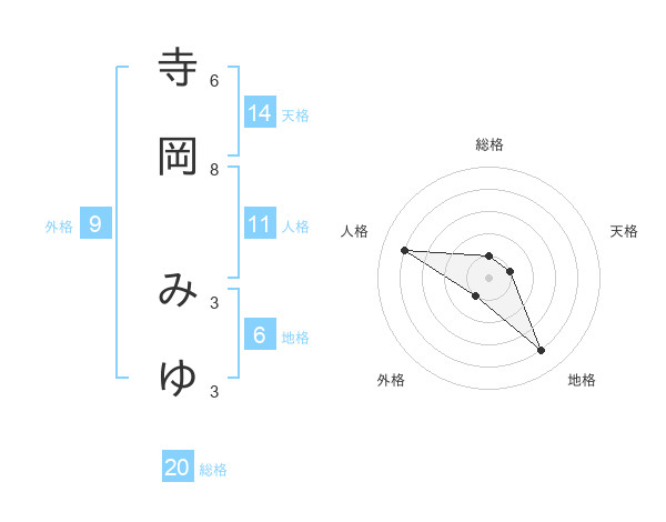 寺岡 みゆさんの総格は20画の1点!