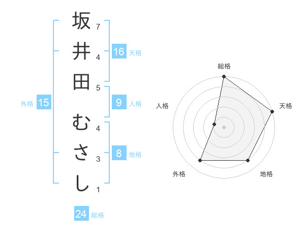 坂井田 むさしさんの総格は24画の5点!