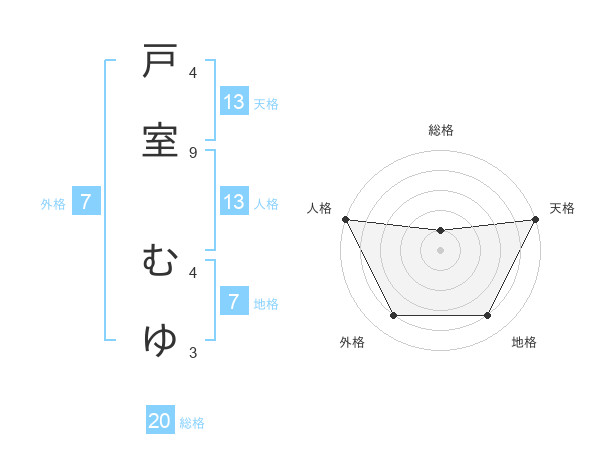 戸室 むゆさんの天格は13画の5点!