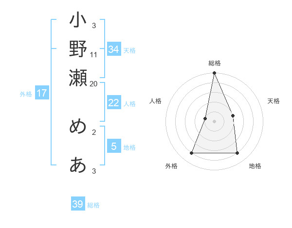 小野瀬 めあさんを姓名の画数から五運を鑑定