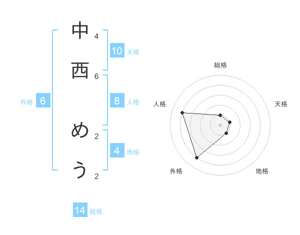 中西 めうさんの総格は14画の1点!