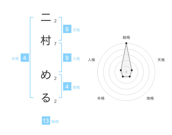 二村 めるさんの総格は13画の5点!